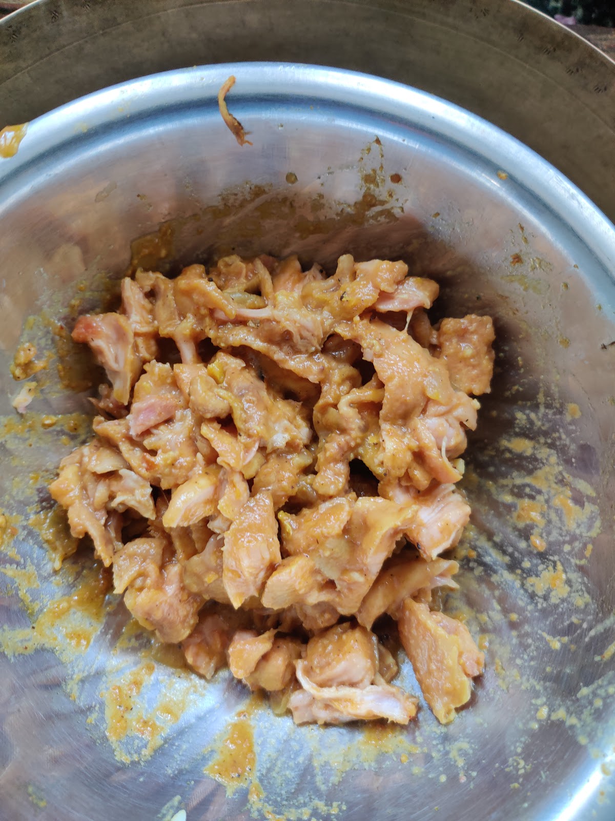8) Spread the chicken evenly on the dough, place the another part of dough and spread gently.